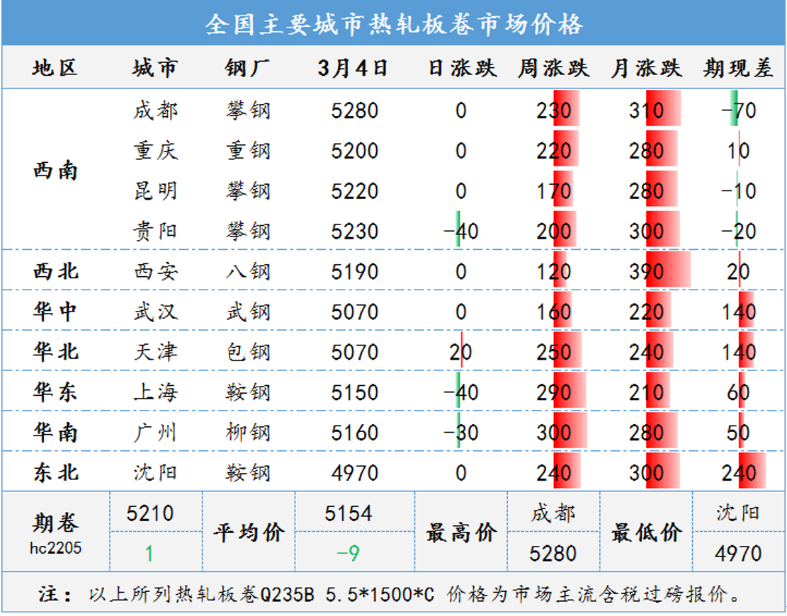 近期俄乌冲突加剧,国际大宗商品价格普涨,带动国内期货市场大幅上涨;铁矿、焦炭等原料价格持续上涨,市场炒作情绪进一步升温;目前正值两会敏感时间窗口,市场对利好政策存在预期,加之各地重大项目工程集中开工,对市场信心支撑较强,本周全国钢材市场大幅上涨。总体看,近期国际形势复杂多变,资本市场的频繁波动,对现货引导作用明显。