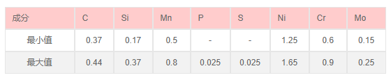 合金结构钢化学成分:碳C0.380.45%,硅Si0.170.37%,锰Mn0.500.80%,硫S:允许残余含量≤0.035%,磷P:允许残余含量≤0.035%,铬Cr0.901.20%,镍Ni:允许残余含量≤0.030%,铜Cu:允许残余含量≤0.030%,钼Mo0.150.25%